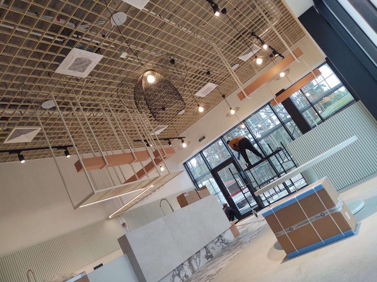 - Die Verwendung von Rasterdecken ermöglicht die Schaffung verschiedener Beleuchtungssysteme, die Verwendung verschiedener Lampentypen, einschließlich der in den Raum hinter der abgehängten Decke integrierten Lampen. Dies ermöglicht eine Vielzahl von Lichteffekten und erweitert generell die Möglichkeiten der Raumgestaltung.